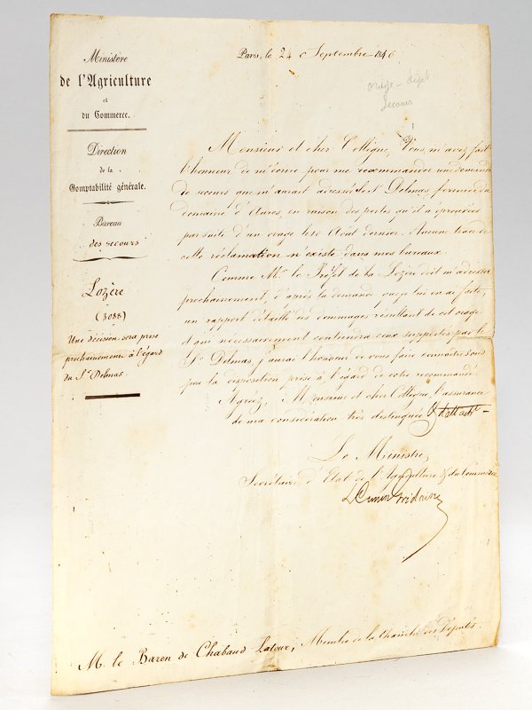 [ Lettre signée du Ministre Secrétaire d'Etat de l'Agriculture et du Commerce, adressée le 24 Septembre 1846, à M. le Baron de Chabaud Latour, Député de la Lozère ] "Monsieur et Cher Collègue, Vous m'avez fait l'honneur de m'écrire pour me recommander une demande de secours que m'aurait adressée le Sr. Delmas, fermier du domaine d'Aures, en raison des pertes qu'il a éprouvées par suite d'un orage le 10 Août dernier". | Livres anciens et modernes | Ministère De L'Agriculture, Bureau Des Secours, Cunin-Gridaine, Laurent