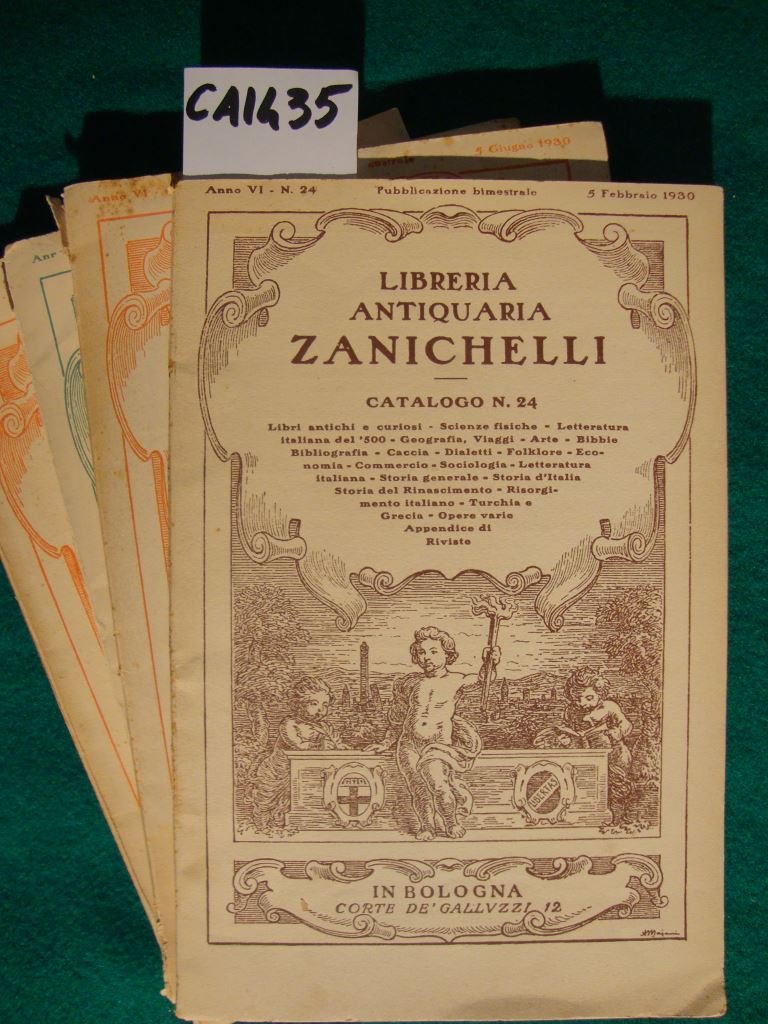 Cataloghi trimestrali corredati da alcune figure in b.n. f.t. Disponiamo esclusivamente dei seguenti cataloghi relativi all'anno 1930 : n. 24 del 5 febbraio, n. 25 del 5 giugno, n. 26 del 12 novembre, n. 34 del 25 novembretra gli argomenti dei titoli presenti a catalogo: libri antichi e curiosi, scienze fisiche, letteratira italiana del '500, geografia, viaggi, arte, sociologia, storia d'Italia e del Risorgimento, Turchia e Grecia, Figurati, belle arti, incunabili, Edizioni Diamante, lettere, curiosità, - DETTAGLIO DELLE CONDIZIONI : Marginali e minuti strappeti alla copertina editoriale; minute fioriture sparse - (33h).