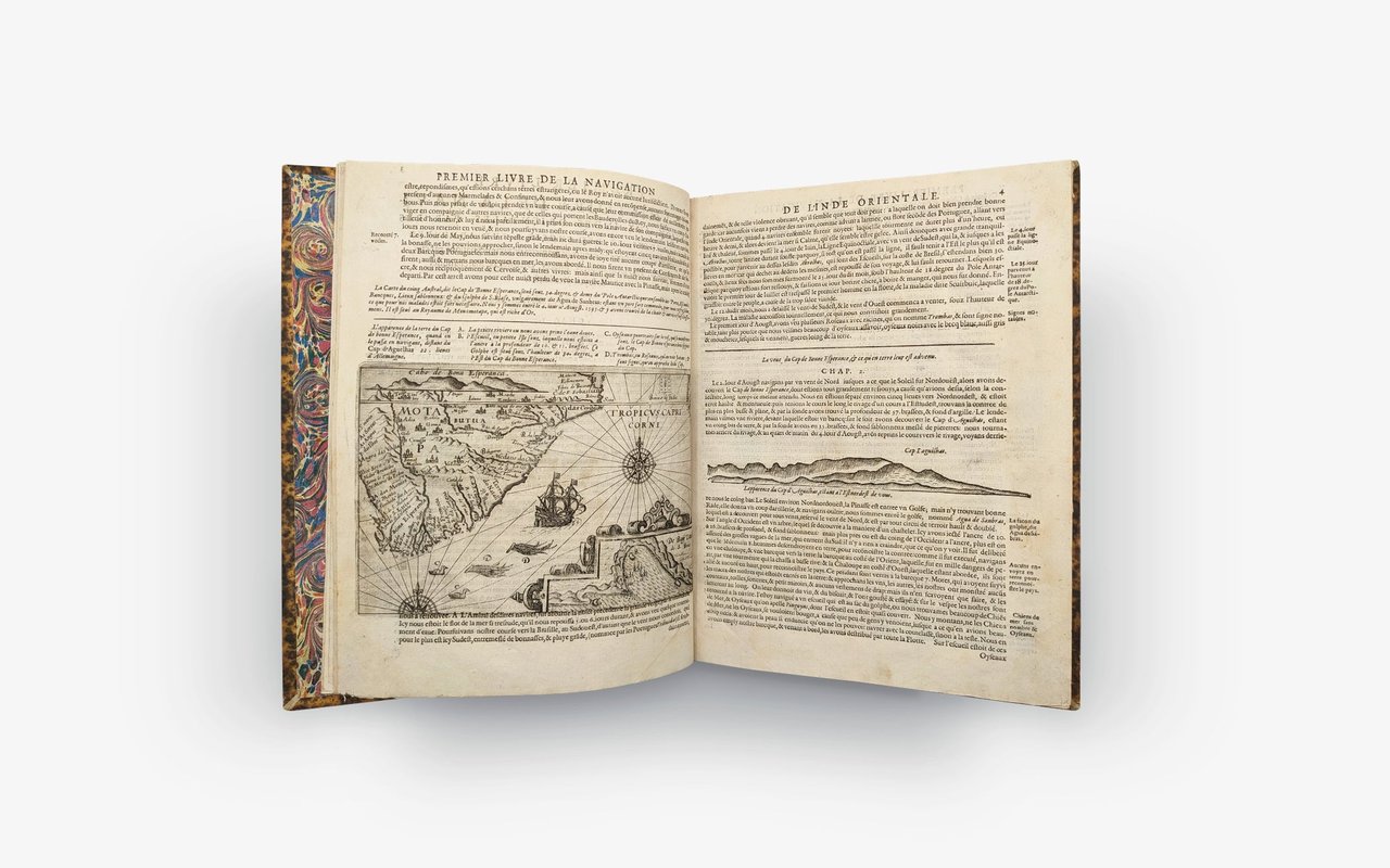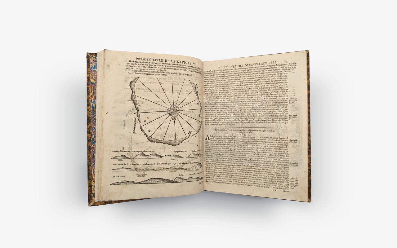 Lodewijcksz - Premier Livre de L'histoire de la Navigation aux Indes Orientales par les Hollandois, et des choses a eux advenues ensembles les conditions, les meurs, et manieres de vivre des nations, par eux abordees. Pkus les Monnoyes, Espices, Drogues, & marchandises, & le pris d’icelles. Davantage les de couvremens & apparences, situations, & costes maritimes des contrees, avec levray pourtraict au vif des habitations : Le tout par plusieurs figures illustré : tres recreatif a lire a tous navigans & amateurs des navigations lointaines, es terres estrangeres. G. M. A. VV. L.