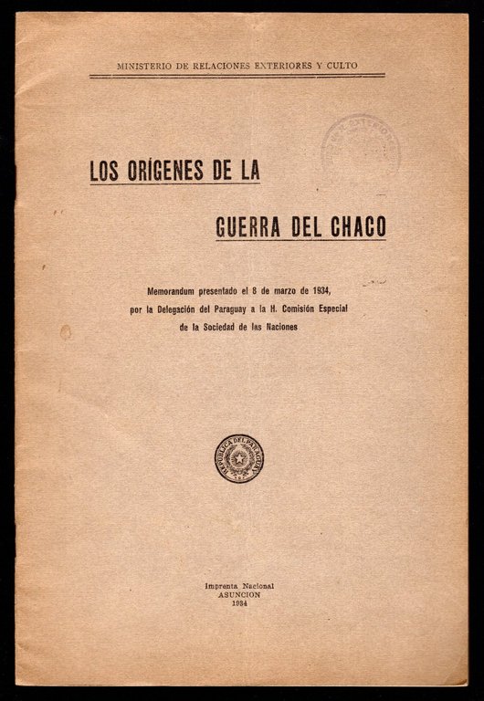 Opuscolo vintage in-8° con 28 pagg, Asuncion, 1934. Saggi. Testo in lingua spagnola. Memorandum presentado el 8 de marzo de 1934, por la Delegation del Paraguay a la H. Comision Especial de la Sociedad de las Naciones. Timbro in copertina. Segno di piegatura verticale.