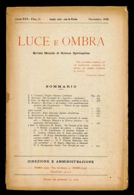 Opuscolo vintage. Rivista mensile di scienze spiritualiste. Argomento: medicina. Autore: AA.VV. Editore: n.d. Luogo: Roma. Anno: 1930. Formato: in-8°. Pagg: n.d. Legatura: brossura. Conservazione: buona. Non rifilato. Ordinario segno del tempo.