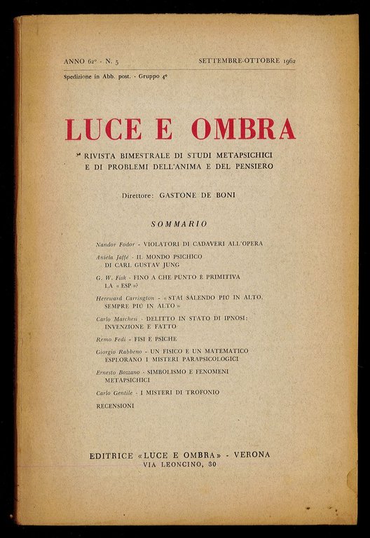 Opuscolo vintage. Rivista bimenstrale di studi metapsichici e di problemi dell'anima e del pensiero. Argomento: medicina. Autore: De Boni Gastone (direttore). Editore: Editrice Luce e ombra. Luogo: Verona. Anno: 1962. Formato: in-8°. Pagg: n.d. Legatura: brossura. Conservazione: buona.