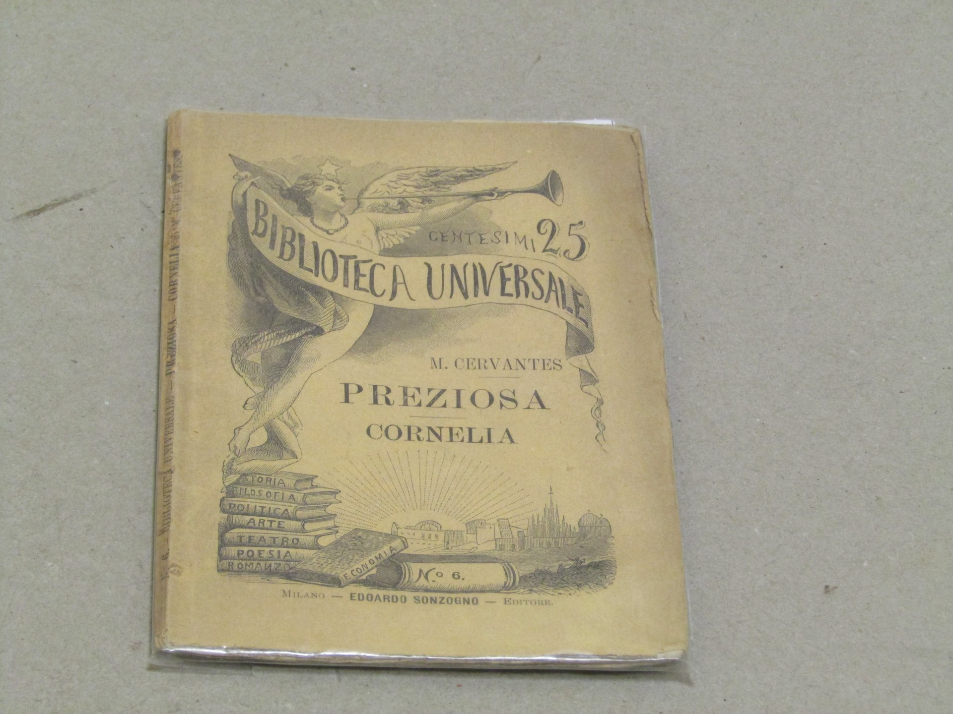 M. Cervantes M. Cervantes. Preziosa e Cornelia. Milano, Sonzogno 1882 - I italiano, in sedicesimo pp.100 Raccolta di racconti. Copertina e pagine ingiallite e usurate.