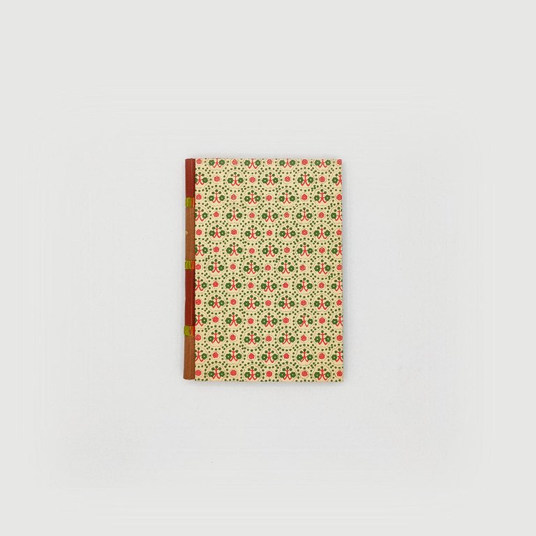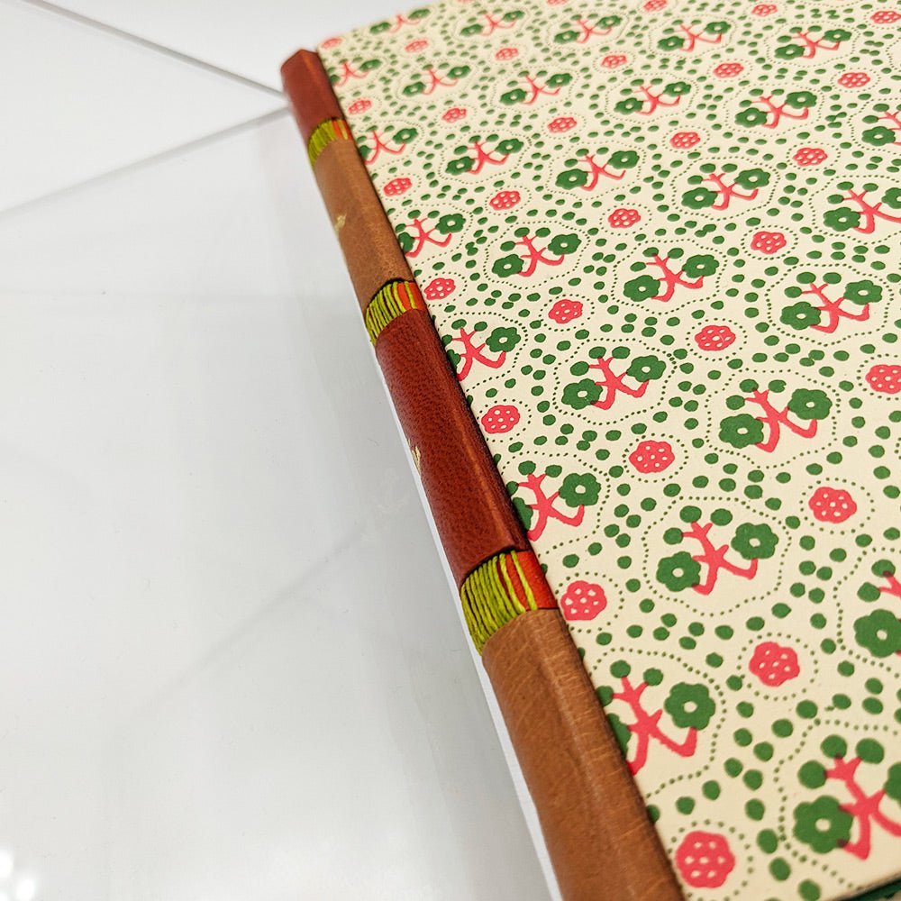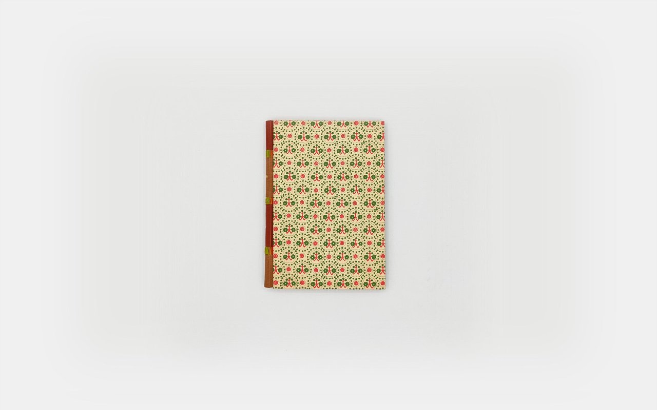 The cover paper reveals a sort of green and red floral pattern, also in very good taste and matching well with the spine. Pasting cover on green paper, white endpapers, cover preserved.