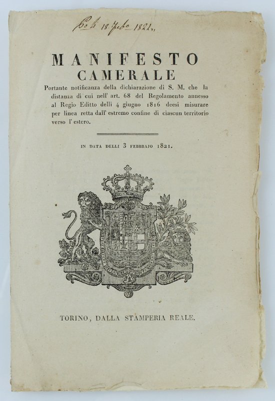 MANIFESTO CAMERALE Portante notificanza della dichiarazione di S.M. che la distanza di cui nell'art. 68 del Regolamento annesso al Regio Editto delli 4 giugno 1816 deesi misurare per linea retta. In data delli 3 febbraio 1821 [documento originale] | Livres anciens et modernes | Carlo Felice Di Savoia