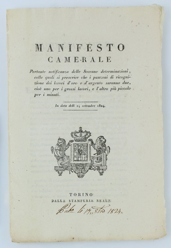 MANIFESTO CAMERALE Portante notificanza delle Sovrane determinazioni, colle quali si prescrive che i punzoni di ricognizione dei lavori d'oro e d'argento saranno due. In data delli 24 settembre 1824. | Livres anciens et modernes | Carlo Felice Di Savoia