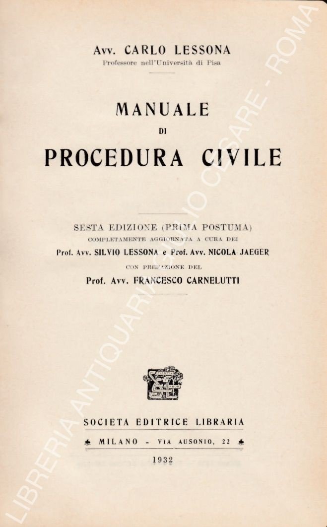 Manuale di procedura civile. Con prefazione del Prof. Avv. Francesco Carnelutti | Livres anciens et modernes | Lessona Carlo