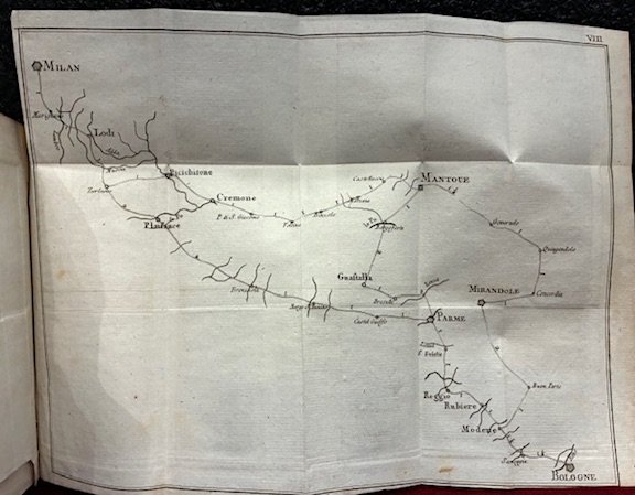 12mo (cm. 16,5), 258 pp., 2 cc.nn. Con 8 carte itinerarie più volte ripiegate in fine. Legatura coeva in vitello maculato. Ricchi fregi e titolo oro impressi al dorso. Tagli rossi. Carte di guardia marmorizzate. Esemplare in ottimo stato di conservazione. Prima rara edizione, censita da ICCU in due sole biblioteche italiane. Non in Fossati Bellani.