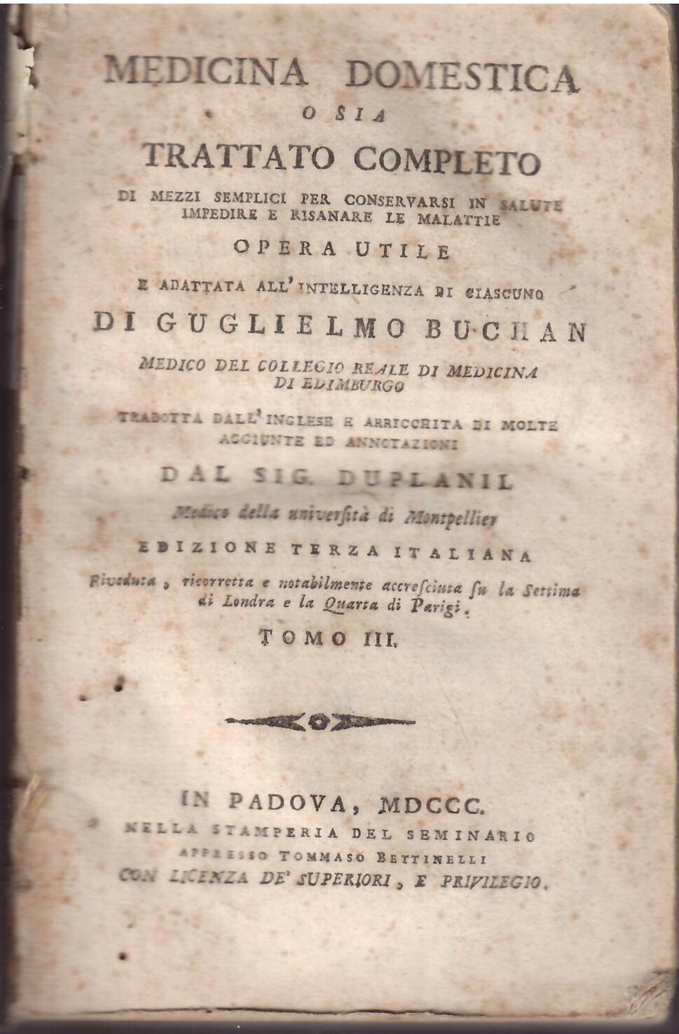 MEDICINA DOMESTICA O SIA TRATTATO COMPLETO DI MEZZI SEMPLICI PER CONSERVARSI IN SALUTE IMPEDIRE E RISANARE LE MALATTIE - TOMO - III -