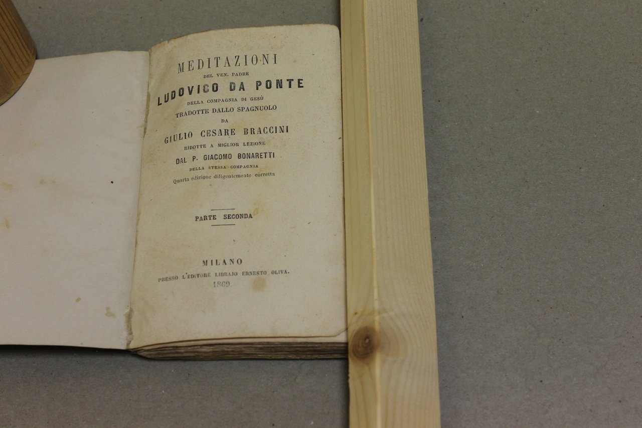 Ludovico da Ponte Meditazioni. Parte seconda. Milano, Ernesto Oliva 1869 italiano, 16 10,5 pp. 288 Meditazioni del venerabile padre Ludovico da Ponte della Compagnia di Gesù tradotte dallo spagnuolo da Giulio Cesare Braccini, ridotte a miglior lezione dal P. Giacomo Bonaretti della stessa compagnia. Quarta edizione diligentemente corretta. Parte seconda.