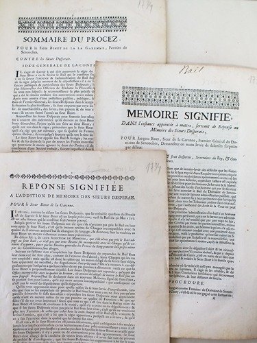 3 brochure in-folio, De l'Imprimerie de Mesnier, Au Soleil d'Or, 1732, 9 pp. ; De l'Imprimerie de la Veuve d'André Knapen, 1734, 5 pp. ; et 7 pp. : Titres : Mémoire Signifié, dans l'Instance appointée à mettre, servant de Réponse au Mémoire des Sieurs Desperais, pour Jacques Binet, Sieur de la Garenne, Fermier Général du Domaine de Senonches, Demandeur en main-levée de défenses surprises par défaut. Contre les Sieurs René & Jean Desperais, Secretaires du Roy, & Controlleurs des Guerres, Défendeurs [ On joint : ] Réponse Signifiée à l'Addition de Mémoire des Sieurs Desperais, pour le Sieur Binet de la Garenne [ On joint : ] Sommaire du Poroces, pour le Sieur Binet de la Garenne, Fermier de Senonches, contre les Sieurs Desperais "Les Sieurs Desperais ont été pendant longues années Fermiers du Domaine de Senonches, apartenant ) Madame la Princesse de Conty, c'est-là où ils ont gagné cette fortune immense dont ils jouissent aujourd'hui. Le beau-père du S. Binet étoit leur caution, le S. Binet lui même étoit leur homme de confiance, qui faisoit toutes leurs affaires. Les Srs Desperais contens de leur fortune ne jugèrent pas à propos de continuer cette régie, leur bail étant expiré, ils cherchèrent à s'illustrer ; l'un acheta une Charge de Secrétaire du Roi, l'autre une Charge de Controlleur des guerres". Très intéressant suite de mémoires rédigés par le Conseiller au Parlement Roland de Challerange. La Princesse de Conti, fille du Duc d'Enghien, était devenue propriétaire de la forêt de Senonches, dont sa fille la Princesse de la Roche sur Yon hérita en 1732.