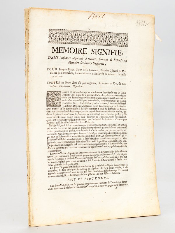 Mémoire Signifié, dans l'Instance appointée à mettre, servant de Réponse au Mémoire des Sieurs Desperais, pour Jacques Binet, Sieur de la Garenne, Fermier Général du Domaine de Senonches, Demandeur en main-levée de défenses surprises par défaut. Contre les Sieurs René & Jean Desperais, Secretaires du Roy, & Controlleurs des Guerres, Défendeurs [ On joint : ] Réponse Signifiée à l'Addition de Mémoire des Sieurs Desperais, pour le Sieur Binet de la Garenne [ On joint : ] Sommaire du Poroces, pour le Sieur Binet de la Garenne, Fermier de Senonches, contre les Sieurs Desperais | Livres anciens et modernes | Roland De Challerange, Maître