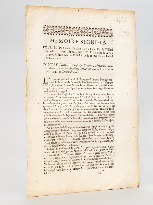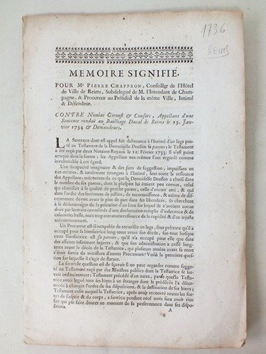 1 brochure in-folio, De l'Imprimerie de la Veuve d'André Knapen, au bas du Pont Saint Michel, Au bon protecteur, 1736, 14 pp. Titre : Mémoire Signifié, pour Me Pierre Chappron, Conseiller de l'Hôtel de Ville de Reims, Subdélégué de M. l'Intendant de Champagne, & Procureur au Présidial de la même Ville, Intimé & Défendeur. Contre Nicolas Giroust & Consors, Appellans d'une Sentence renduë au Bailliage Ducal de Reims le 15 Janvier 1734 & Demandeurs. "Un Procureur est-il incapable de recueillir un legs, sous prétexte qu'il a occupé pour sa bienfaitrice long-tems avant son décès, sur-tout lorsque cette bienfaitrice est sa parente, qu'il n'a occupé pour elle que dans des affaires infiniment legeres, & que son administration a cessé longtems avant le décès de la Testatrice . ?". Bon état