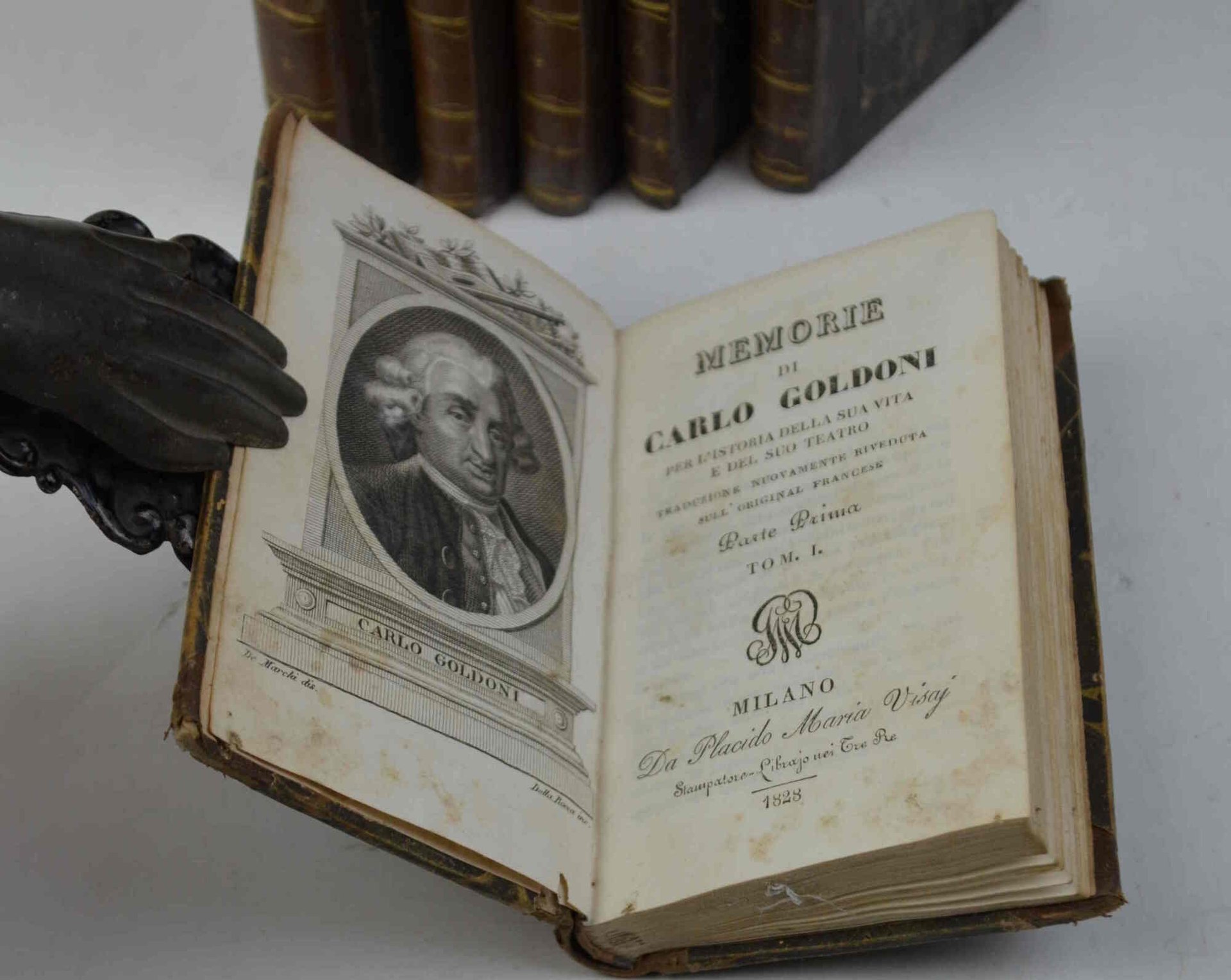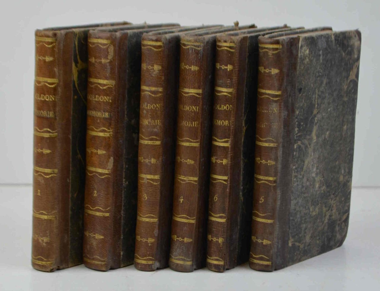 Sei volumi di cm. 13, pp. oltre 1000 complessive. Ritratto di Goldoni inciso in rame all'antiporta del primo volume. Graziosa legatura coeva in mezza pelle, dorsi lisci con titoli e fregi in oro. Qualche moderato segno d'uso, ma complessivamente esemplare genuino e ben conservato.