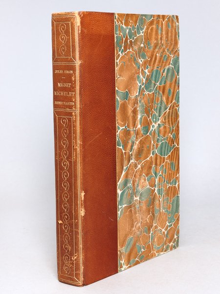 1 vol. in-8 reliure demi-chagrin maroquiné brun orangé, Calmann Lévy, Ancienne Maison Michel Lévy Frères, Paris, 1890, 367 pp. et 1 f. Bon exemplaire bien relié (dos très lég. frotté). Très intéressant ouvrage, dans lequel Jules Simon évoque la pensée des trois historiens, dont celle de Jules Michelet, dont il fut l'élève à l'Ecole Normale Supérieure, et dont il pu écrire dans ses Mémoires qu'entre Michelet et Jules Cousin, le premier était le philosophe et le second l'historien !