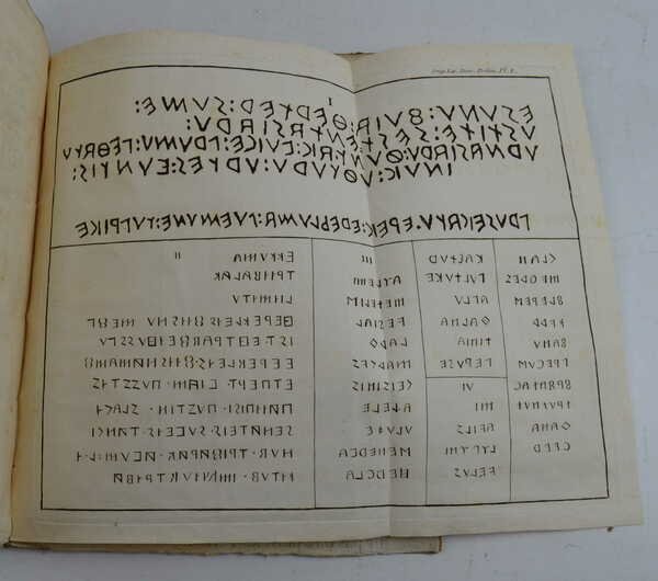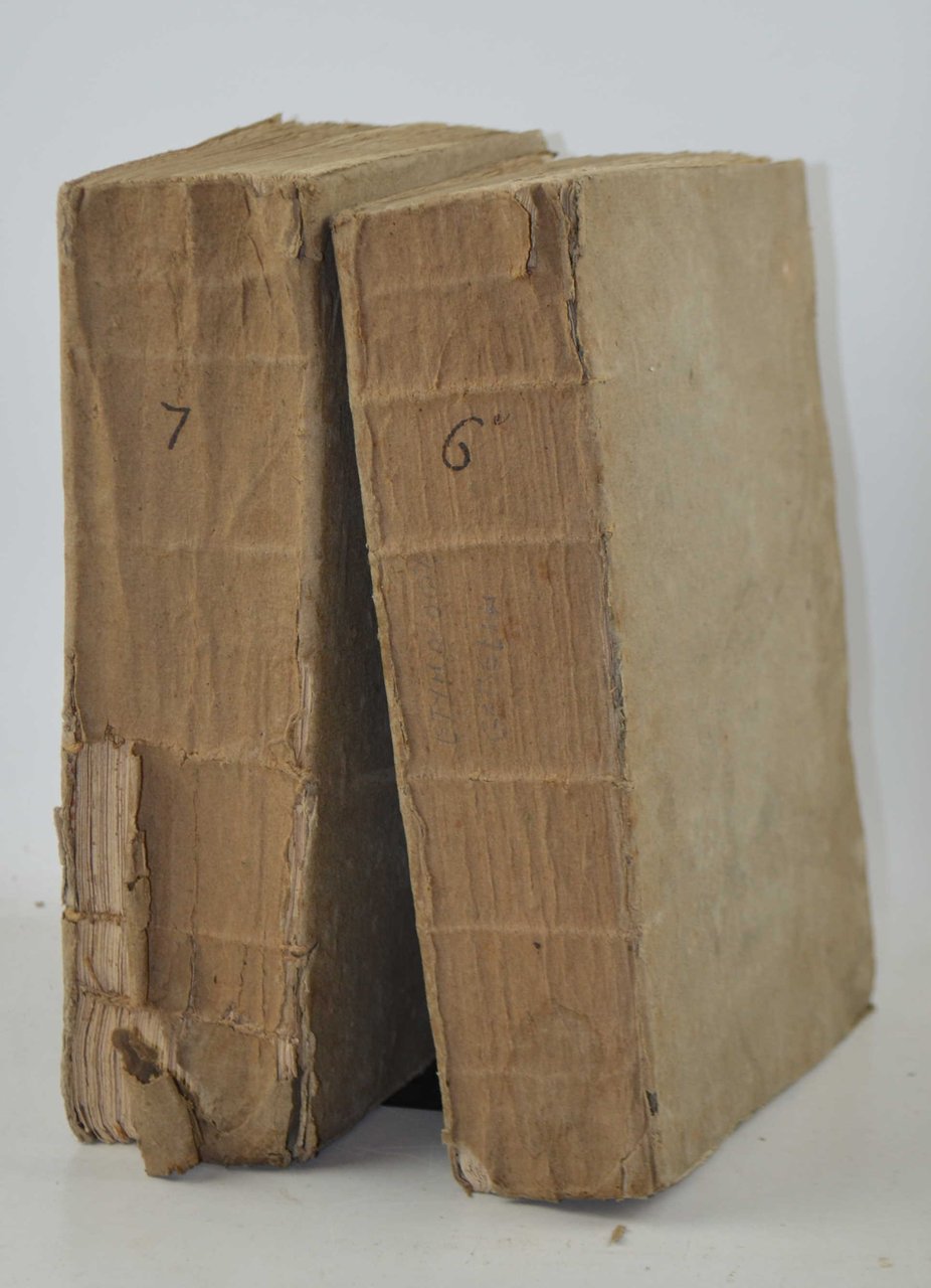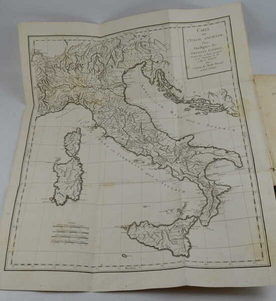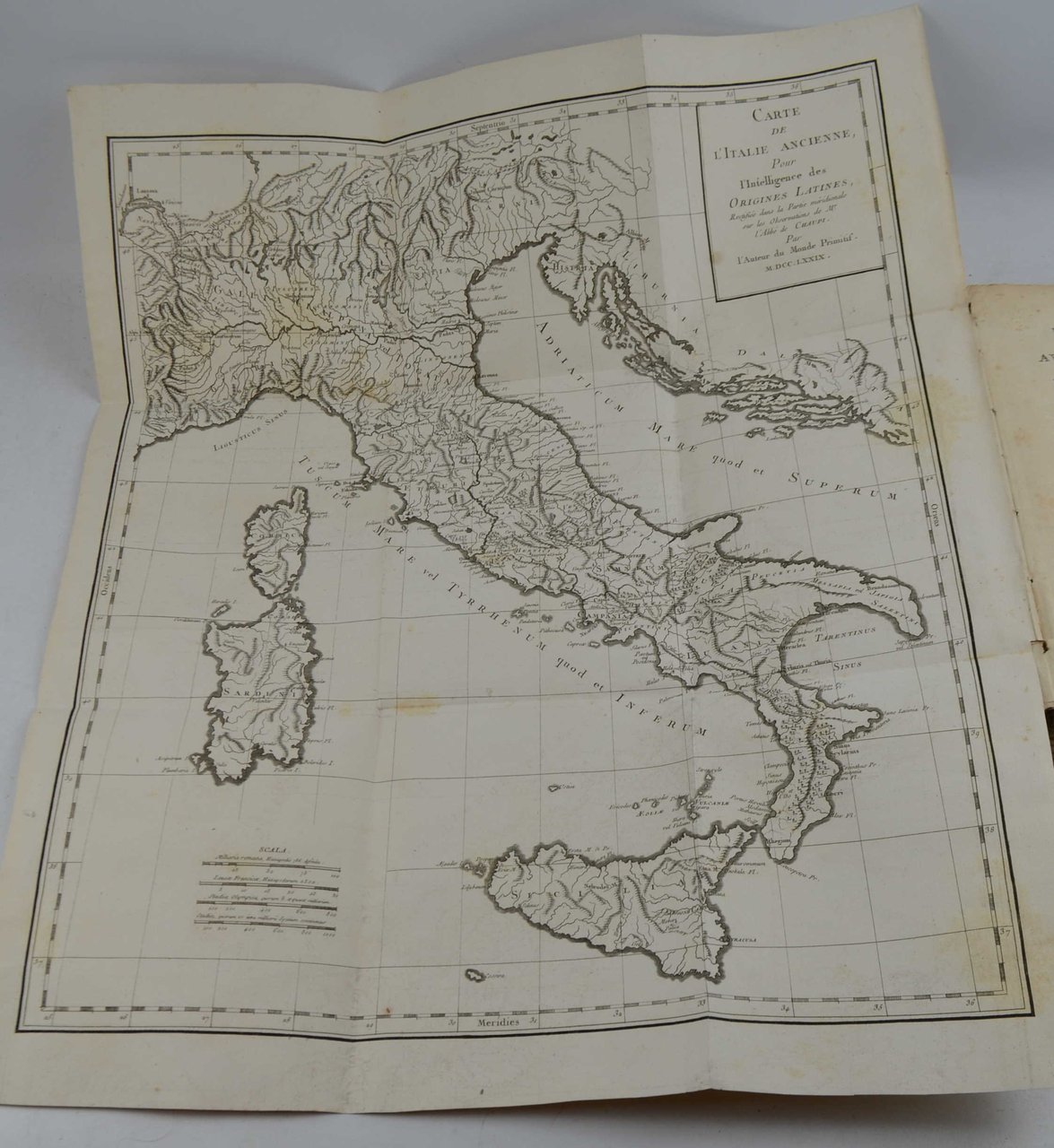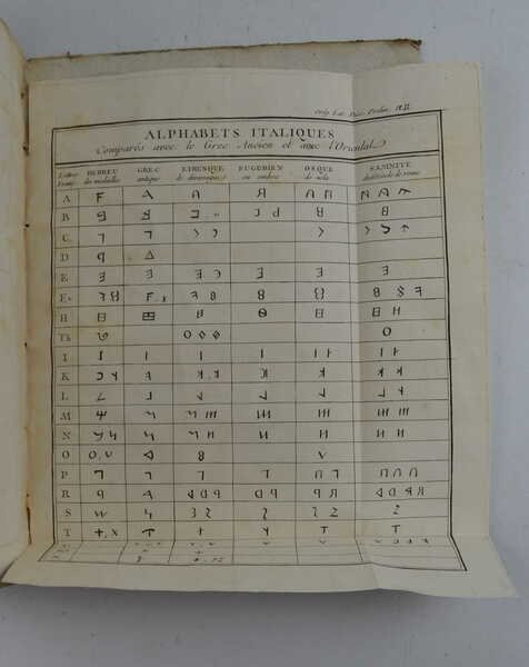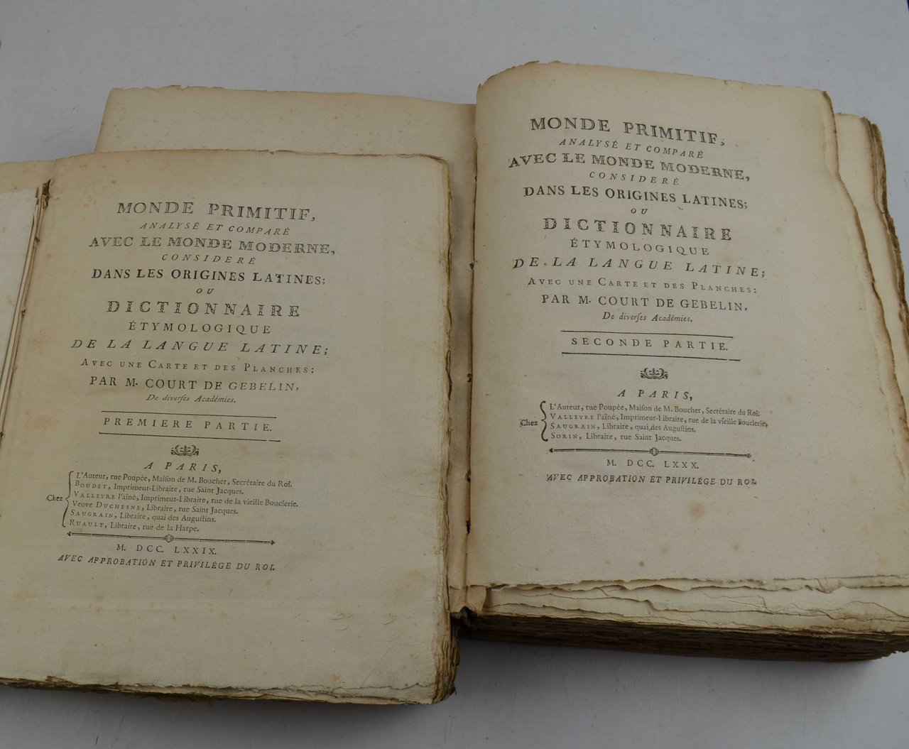 Due grossi volumi di cm. 27, pp. cccxxviii, xx, 2314 + (2) d'errata complessive. Con due tavole d'alfabeto ed una grande carta geografica dell'Italia antica incisa in rame e più volte ripiegata fuori testo (stampata su carta forte, di cm. 60 x 50). Leg. in cart. muto coevo. Minime mende ad un dorso, peraltro bell’esemplare, in barbe e parzialmente a fogli chiusi. Parte monograficamente completa della celebre opera enciclopedica riguardante lo studio delle lingue ed il meccanismo della parola compilata da Court de Gebelin. Considerata un monumento d’erudizione, dal quale Fabre Olivet prese ispirazione per la sua storia filosofica del genere umano, è divenuta pressochè introvabile completa dei nove volumi divisi per vari argomenti. La presente sezione riguarda interamente la lingua latina e comprende un lungo studio introduttivo seguito dal dizionario etimologico.