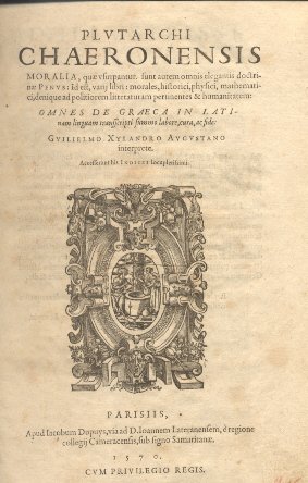 Moralia, quae usurpantur sunt autem omnis elegantis doctrinae Penus: id est varij libri: morales , historici, physici, mathematici, denique ad politiorem litteraturam pertinentes e humanitatem: omnes de graeca in latinam linguam transscripti summo labore, cura ac fide Guilielmo Xylandro Augustano interprete.