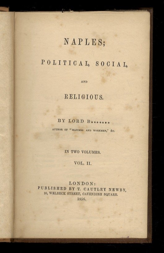 Naples. Political, social, and religious. By Lord B*******, author of "Masters and workmen", &c. In two volumes. Vol. I [- vol. II].