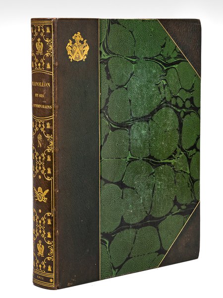 Publiée par Auguste de Chambure, 1 vol. grand in-4 reliure demi-maroquin à coins vert, dos lisse orné en long à motifs impériaux (aigle, abeilles, bicorne.), armoiries poussées en super-libris en mors (chevron et trois annelets), tête dorée, filet doré en mors et coins, reliure signée de V. Champs, Bossange Père, Bossange Frères, Paris, 1825, XV-364 pp. avec 47 planches hors texte (portrait en frontispice, 44 planches numérotées, le dessin de Deveria et une autre planche par Desenne, non chiffrée) Edition originale, très bien reliée par Champs, de ce monument de la légende napoléonienne. Bon état (dos passé, coupes et plats lég. frottée, infime frott. en dos, des rouss., très bon état par ailleurs) pour cet exemplaire très élégant, relié aux armes des Vicaire, II, 172