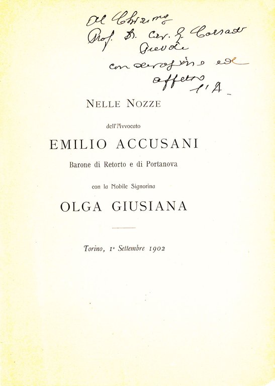 Mm. 295 x 203. Pp. [8]. Brossura coeva (brunita, copertina anteriore staccata, mancanze marginali e strappi). Dedica manoscritta dell'autore al frontespizio. Testo del sacerdote Giovanni Camera per felicitarsi delle nozze tra l'Avvocato Emilio Accusani Braone di Retorto e di Portanova con la Nobile Signorina Olga Giusiana, celebrate a Torino il 1 Settembre 1902.