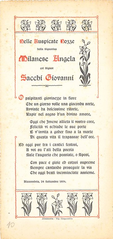Nelle auspicate nozze della Signorina Milanese Angela col Signore Sacchi Giovanni