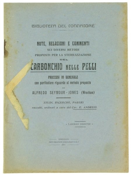 NOTE, RELAZIONI E COMMENTI SUI DIVERSI METODI PROPOSTI PER LA STERILIZZAZIONE DEL CARBONCHIO NELLE PELLI. | Livres anciens et modernes | Andreis E.