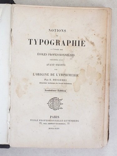 Précédées d'un avant-propos sur l'origine de l'Imprimerie par E. Desormes, troisième édition, 1 vol. grand in-8 reliure pleine toile noir, dos muet, Ecole professionnelle Gutenberg, Paris, 1895, 483 pp. Rare exemplaire de ce vrai manuel de typographie. Etat moyen (reliure modeste un peu faible, des rouss.). Prix en l'état pour cet excellent exemplaire de travail, rare et recherché.
