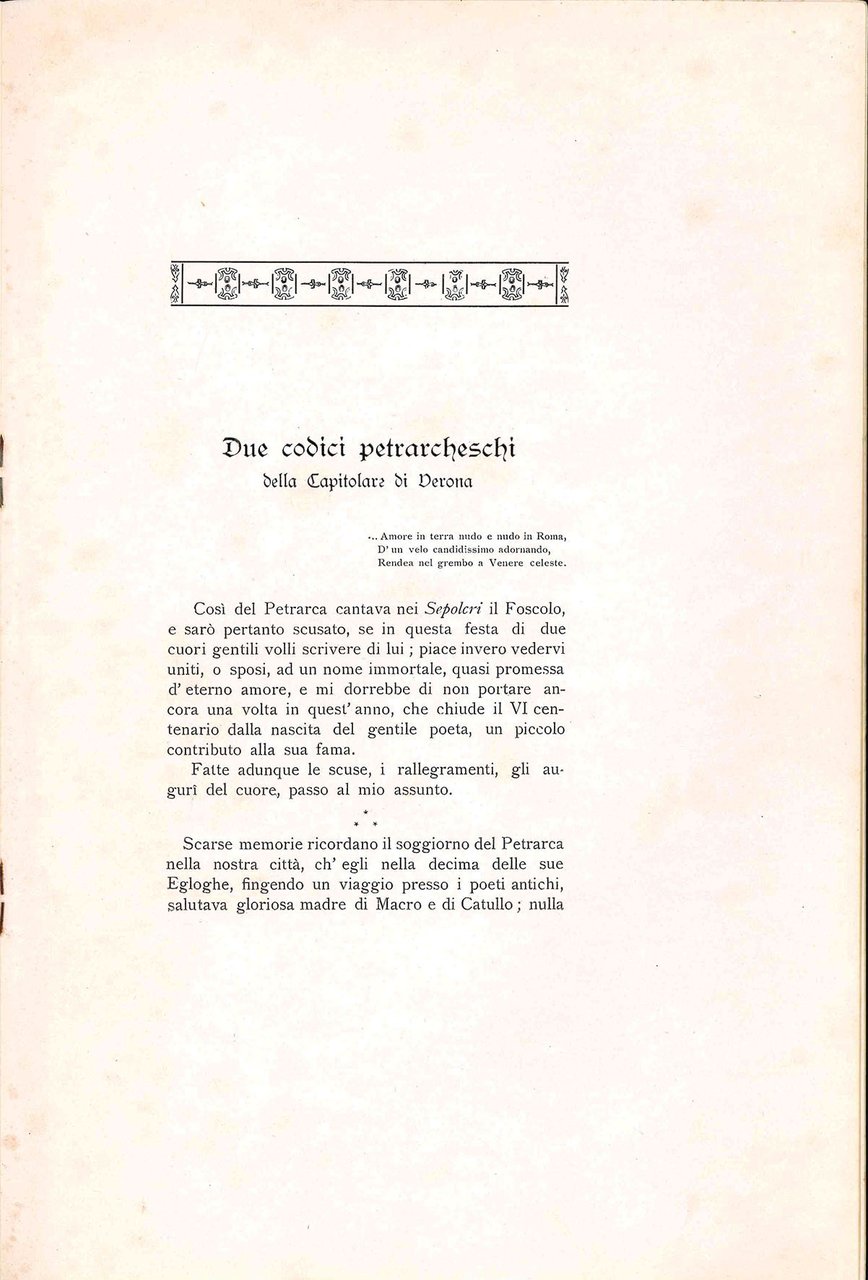 Mm. 295 x 195. Pp. 22, [1]. Brossura coeva con titolo entro sinuosa cornice colorata (brunita e con fioriture). Dedica agli sposi Maria Marchiori e Albino Nocenti, da parte di diversi amici dei due. Seguono la poesia anonima in otto quartine, intitolata L'ora nuziale, e due codici petrarcheschi dalla Biblioteca Capitolare di Verona, curate e commentate da Antonio Avena. All'interno bifolio leggermente brunito contenente una lettera al padre della sposa, Guglielmo Marchiori, da parte dell'amico Ing. Gio. Batta Malesani.
