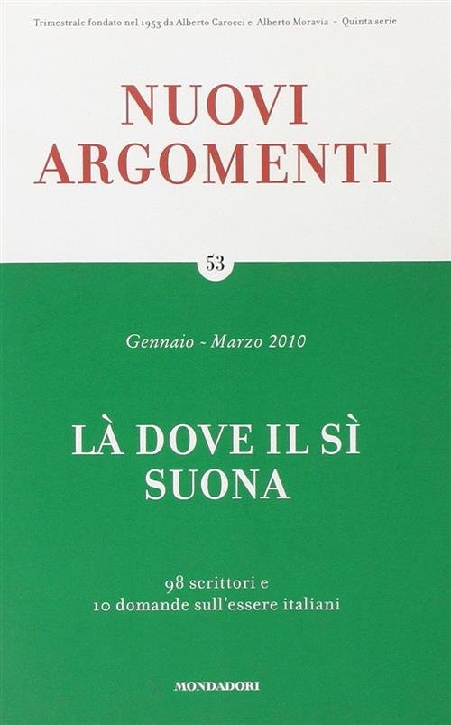 Dettagli Libro<br><br>Sku: PZZLB22750<br>ISBN: 9788804608646<br>Titolo: Nuovi Argomenti. Vol. 53: La Dove Il Si Suona.<br>Editore: Mondadori<br>Anno: 2011<br>Pagine: 247<br>Formato: Brossura<br><br>Nel 1953 Alberto Carocci e Alberto Moravia fondano Nuovi Argomenti, da allora la rivista è rimasta un punto di riferimento per il mondo intellettuale e letterario italiano. Nei suoi cinquantacinque anni di attività si sono alternati alla direzione i principali protagonisti della scena culturale italiana, da Pasolini a Sciascia, da Bertolucci a Siciliano, fino all'impegno attuale di Dacia Maraini. Negli ultimi anni Nuovi Argomenti ha saputo dimostrare la sua straordinaria vitalità scommettendo su molte delle voci più interessanti della nuova generazione di scrittori, tra le quali quelle di Alessandro Piperno, Roberto Saviano e Paolo Giordano.