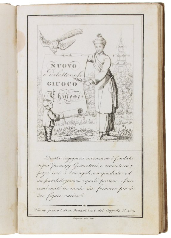 NUOVO DILETTEVOLE GIUOCO CHINESE. Questa ingegnosa invenzione è fondata sopra principj geometrici, e consiste in 7 pezzi cioè 5 triangoli, un quadrato ed un paralellogrammo, i quali possono essere combinati in modo da formare più di 300 figure curiose. | Livres anciens et modernes |