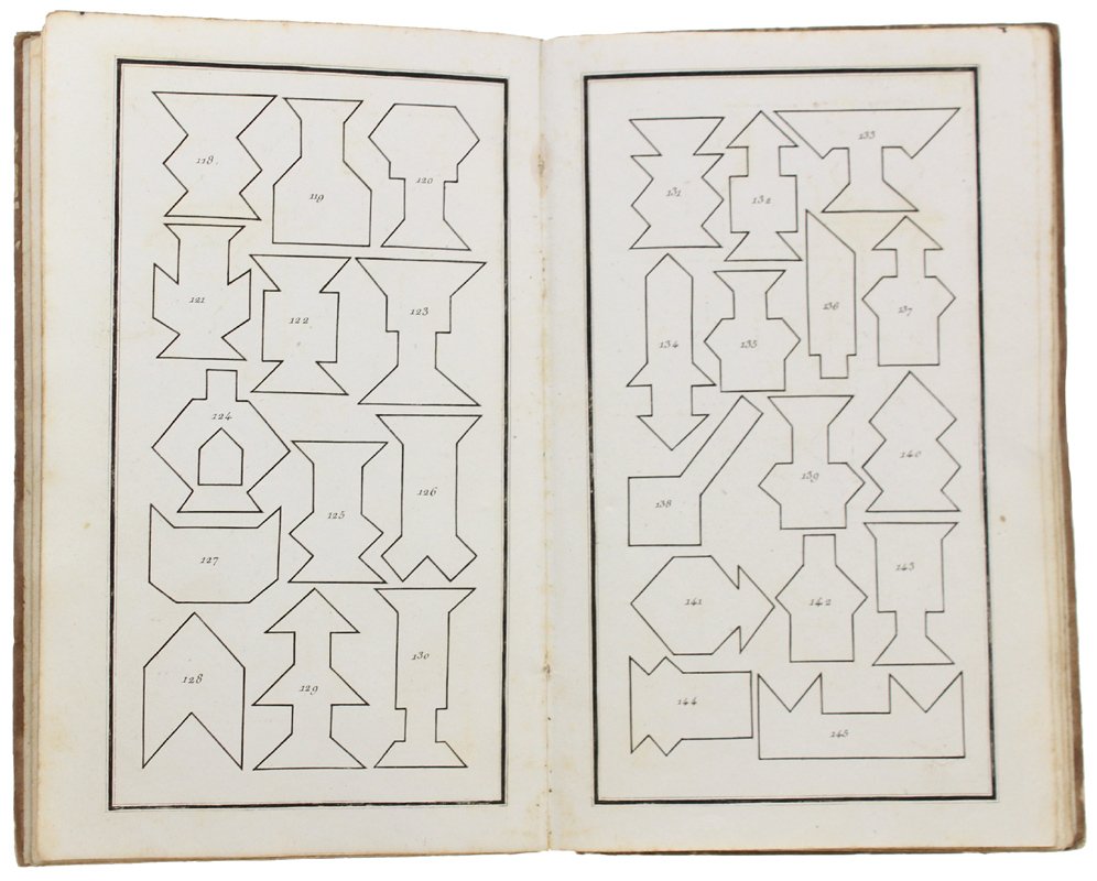(Codice GO/1565) In 8° (19x12 cm). Prima edizione italiana, pubblicata dopo l'edizione inglese The Fashionable Chinese Puzzle del marzo 1817. Frontespizio con incisione in rame + 28 tavole che contengono 323 sagome geometriche. Qualche segno d'uso e del tempo. Legatura cartonana originale, cornici a stampa; abrasioni al dorso. Ottimo, genuino esemplare. ~~~ SPEDIZIONE IN ITALIA SEMPRE TRACCIATA