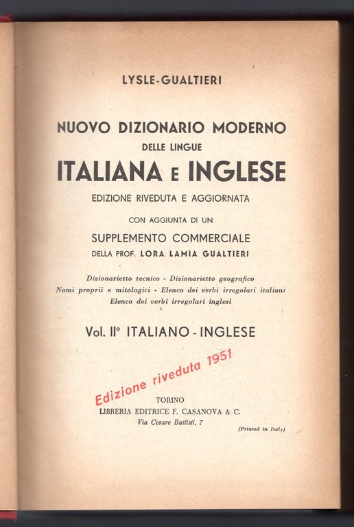 Libro vintage in-16°, cartonato con 191 pagg, Torino, 1951. Dizionari. Titolo impresso sul dorso, piatto muto. Sugaride a colori. Edizione riveduta e aggiornata con aggiunta di un supplemento commerciale della prof. Lora Lamia Gualtieri. Prefazione alla prima edizione di A. de R. Lysle.