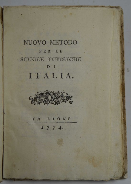 Cm. 23, pp. (4) 156. Legatura coeva in cart. alla rustica. Qualche segno d'uso esterno ed un lavoro di tarlo al margine alto delle carte centrali (lontano dal testo). Esemplare peraltro genuino, marginoso (in barbe e con testimoni) ed in buono stato di conservazione. Prima edizione, rara, di quest'opera in cui il Carli sostiene "...il diritto dello Stato sull'istruzione e le necessità dell'istruzione popolare, proponendo un nuovo dettagliato piano di studi per tutti gli ordini di scuole, prospettando un'educazione realistica e moderna, non soltanto umanistica e letteraria, ma pure civile e pratica, un metodo oggettivo d'insegnamento, sia pur meccanicisticamente delineato" Cfr. TReccani.