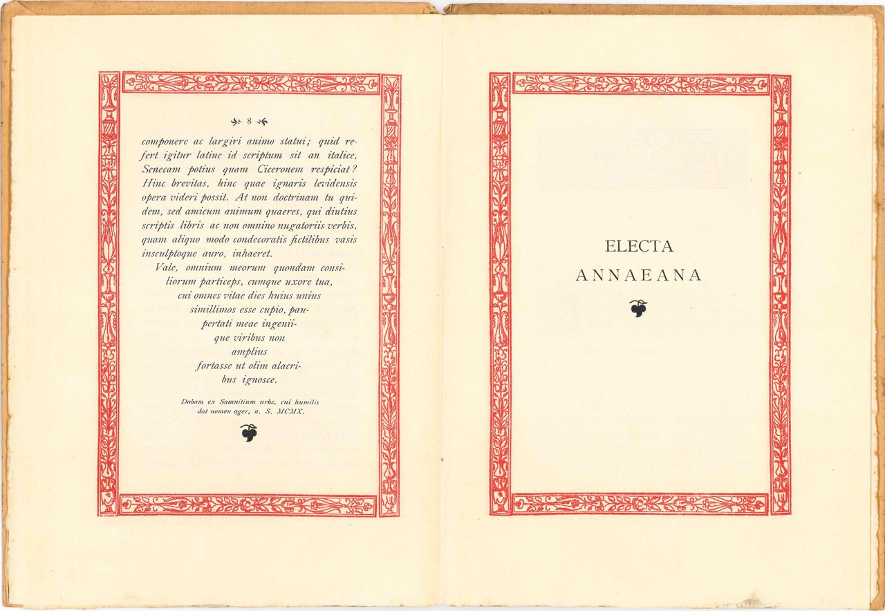 Mm. 230 x 165. Pp. 30. Brossura coeva (leggermente brunita e con fioriture), titolo entro elaborata cornice in stile architettonico . Marca tipografica della Societatis Typographicae Cooperatricis e marca tipografica della Scuola Tipografica Editrice (S. T. E. C. fondata a Città di Castello) con motto Per amore bene fare e i simboli del cuore, della croce, del castello e del giglio. Testo entro cornice dai motivi floreali di colore rosso. Essenziale dedica dell'autore al frontespizio, ampliata di seguito in un testo in lingua latina, agli sposi Achille Pellizzari e Silvia Mazzoni. Segue il breve trattato in latino Electa Annaena di Luigi Castiglioni, latinista, filologo classico, preside della Facoltà di Lettere dell'università statale di Milano (1931-1956), accademico dei Lincei, membro della commissione del Thesaurus Linguae Latinae e direttore del Corpus scriptorum Latinorum Paravianum. Edizione di 100 esemplari.