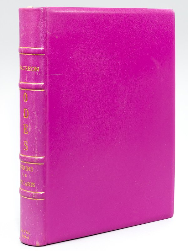 Un des 25 exemplaires hors commerce numérotés en chiffres romains, réservés aux collaborateurs et signés de l'éditeur (n° H.C. X), avec en frontispice un lavis original et une dédicace de Decaris, Traduites en Français par Remy Belleau & Illustrées par Albert Decaris, 1 vol. in-folio reliure plein cuir mauve, dos à 4 nerfs, Les Editions Henri Javal, 1950, 212 pp. et 4 ff. avec un lavis original signé, un frontispice et 20 planches hors texte Belle édition, proposant le texte français, suivi du texte grec, dans un exemplaire du tirage hors commerce enrichi d'une aquarelle originale, signée par Decaris. Etat satisfaisant (petite mouill. ayant décoloré le dos, notice contrecollée en seconde garde, très bon état par ailleurs). Prix en l'état.