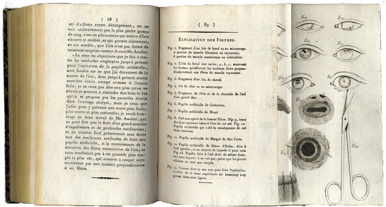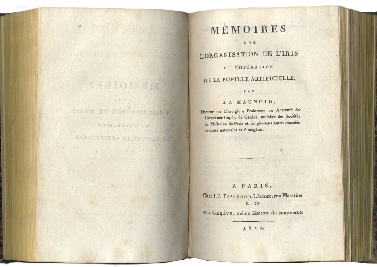 >7 opere in 1 vol. in-8, legatura coeva in m. pelle, tit. oro al dorso, tagli gialli. Raccolta di 6 prime edizioni di opere medico-chirurgiche e di oftalmologia del Maunoir, quella num. IV è di J. Curry): I) Mémoires physiologiques et pratiques sur l'anéurisme et la ligature des artères. Genève, Paschoud, 1802, pp. (4), 130, (2), con 2 tav. inc. ripieg. f.t. - II) Quéstions de chirurgie proposées pour la chaire de clinique externe...de Montpellier...Ivi, Tournel, 1812, pp. 270, (2). - III) Mémoires sur l'organisation de l'iris et l'opération de la pupille artificielle. Paris et Genève, Paschoud, 1812, pp. (4), 69, con 1 tav. inc. f.t. - IV) Observation d'une ophtalmie rémittente, et des effets heureux de l'opium dans son traitement, par James Curry..., traduite par Maunoir. Montpellier, Tournel, s.d., pp. 35. - V) Chirurgie. Troisième lettre à M. Scarpa, s.n.t., pp. 16. - VI) Mémoire sur les fongus médullaire et hématode. Paris et Genève, Paschoud, 1820, pp. XII, 137, (3). - VII) Mèmoires sur les amputations, l'hydrocèle du cou, et l'organisation de l'iris. Genève et Paris, Paschoud, 1825, pp. (4), 159, (2), con 1 tav. litogr. - J.P. Maunoir (1768-1861) nacque a Ginevra e studiò a Parigi ed in Inghilterra; ritornato nella città natale divenne professore d'anatomia nell'Accademia Imperiale e celebre chirurgo oftalmologo, amico di Ant. Scarpa ed autore di numerose opere di notevole importanza scientifica. Ottimo esemplare. Source Book of Ophthalmology n. 1521, 1522 e 1523 (rispettivamente per le opere n. III, VI, VII).