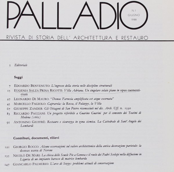 PALLADIO. Rivista di storia dell'architettura. Nuova serie, Anno I - N. I - Giugno 1988. | Livres anciens et modernes | Autori Vari.