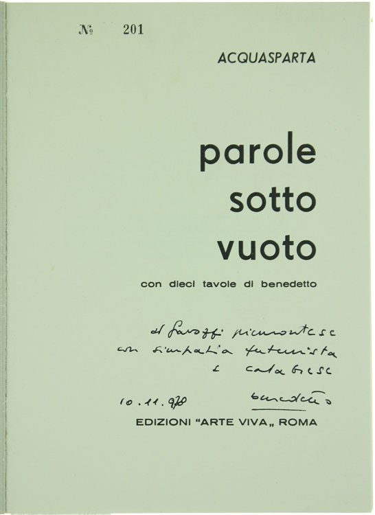 (Codice BN/1877) In 8° (21,5 cm) 54 pp. Dieci tavole parolibere ilustrate, versi a fronte. Dedica autografa firmata di Enzo Benedetto. Edizione numerata, esemplare n. 201. Brossura editoriale. Ottimo. ~~~ SPEDIZIONE IN ITALIA SEMPRE TRACCIATA
