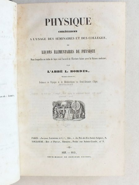 Physique chrétienne à l'usage des séminaires et des collèges ou Leçons élémentaires de physique dans lesquelles on tâche de faire voir l'accord de l'Ecriture Sainte avec la Science moderne. | Livres anciens et modernes | Bordes, Abbé L.
