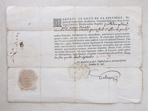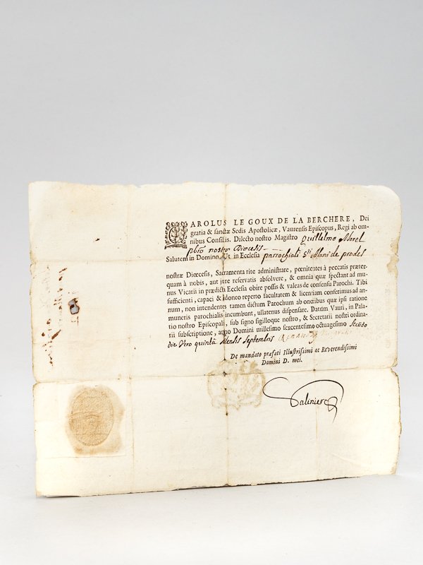 1 pièce oblong en latin, avec cachet de l'évêque, datée du 5 septembre 1682 Etat très satisfaisant. Charles Le Goux de la Berchère fut d'abord évêque de Lavaur (de 1677 à 1685), puis fut déplacé à l'archevêché d'Auch, puis à Albi et enfin à Narbonne à partir de 1703.