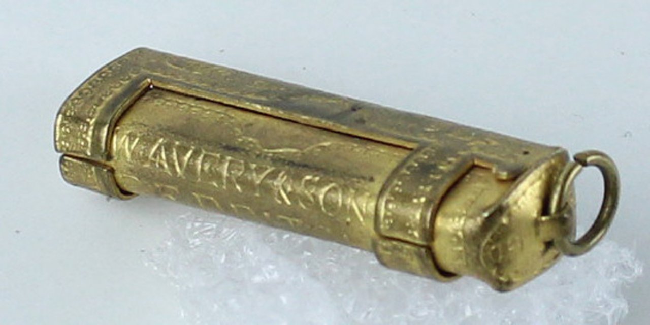 (Codice ZZ/0584) Ottone dorato, superficie decorata con piccoli festoni e arabeschi incisi, anellino. Dimensioni mm 37x12x5 ca. Oggetto originale inglese, circa 1880. Fabbricante: W.Avery & son, Redditch. Stringendolo leggermente si apriva il piccolo foro che liberava l'ago (la molla funziona ma non sembra in grado di trattenere nulla) ~~~ SPEDIZIONE IN ITALIA SEMPRE TRACCIATA