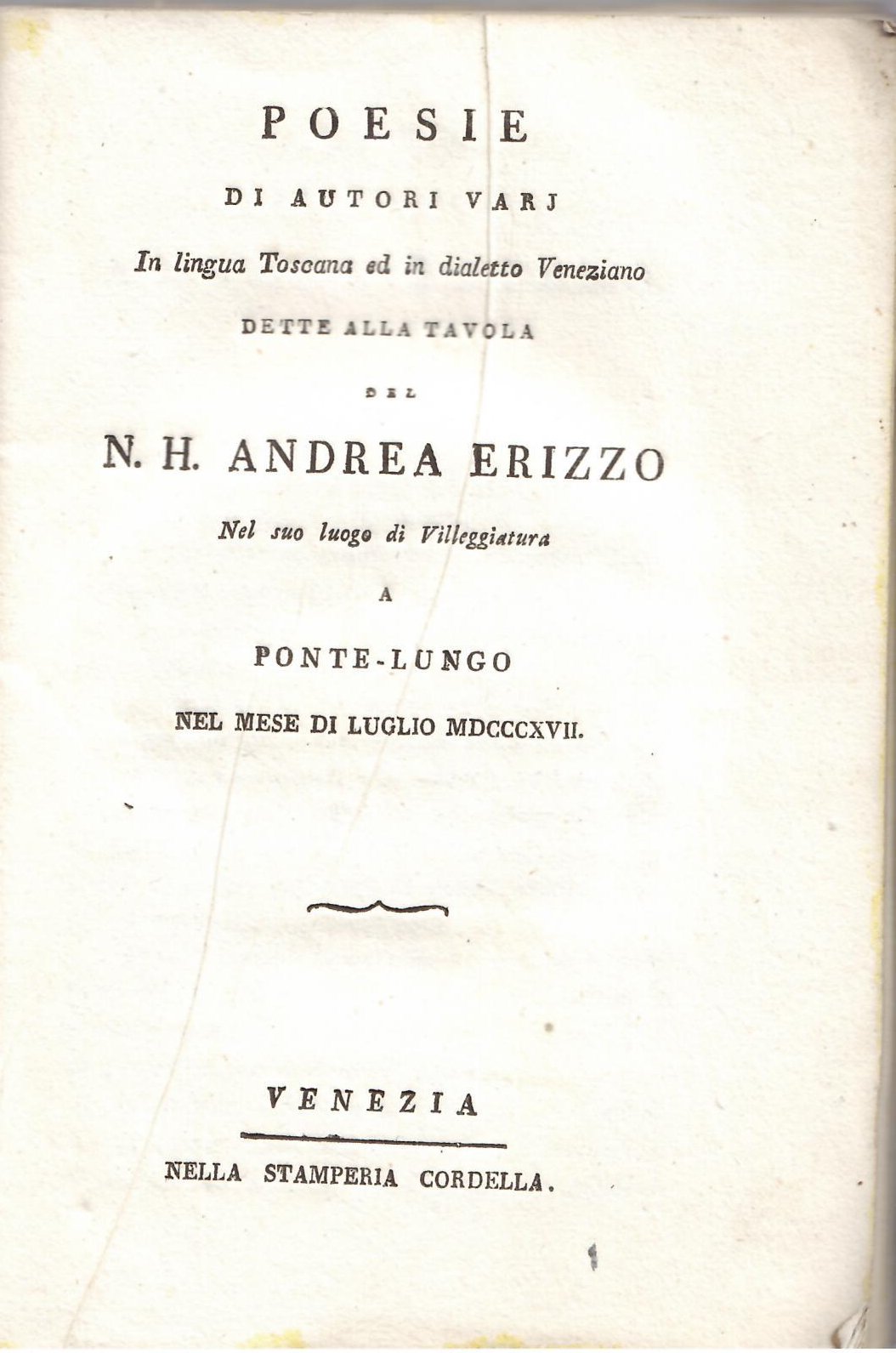POESIE DI AUTORI VARI IN LINGUA TOSCANA ED IN DIALETTO VENEZIANO DETTE ALLA TAVOLA DEL N.H. ANDREA ERIZZO NEL SUO LUOGO DI VILLEGGIATURA A PONTE - LUNGO NEL MESE DI LUGLIO 1817