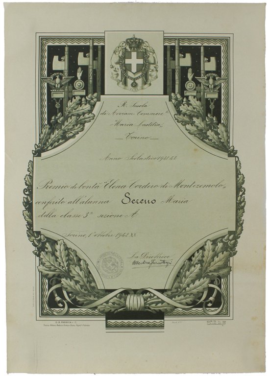 (Codice UO/0010) Diploma originale su carta, cm 48,5x34. Cornice litografica disegnata da Carlo Nicco: rami di quercia, simboli littori e stemma sabaudo centrale. Timbro della scuola e firma della direttrice. Strappeetto marginale, ottimo stato. ~~~ SPEDIZIONE IN ITALIA SEMPRE TRACCIATA