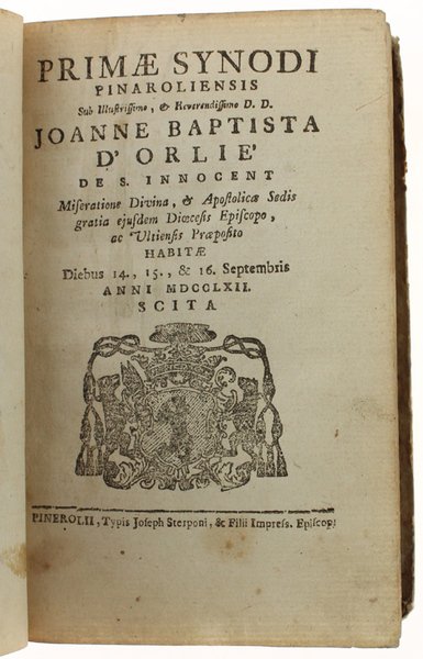 PRIMAE SYNODI PINAROLIENSIS Sub Illustrissimo, & Reverendissimo D.D. Joanne Baptista D'Orlié de S. Innocent. ejusdem Diocesis Episcopo. Habitae diebus 14., 15, & 16. Septembris 1762. Scita.