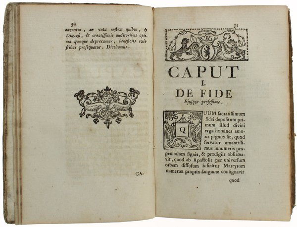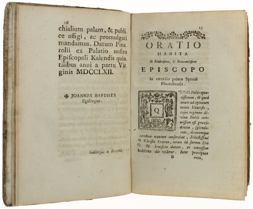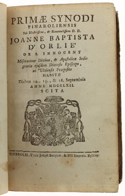 (Codice AN/1336) In 8º antico (19 cm) 375 pp. Prima e unica edizione. Importante documento, opera di rarissima reperibilità. Grande stemma vescovile al frontespizio. Nitida impressione su bellla carta, con testatine, capilettera, finalini xilografici. Cfr. A.Bima in "Libri e tipografia a Pinerolo nel '700" (Bollettino n.51 della Soc. Piem. Archeologia e B.A.): "La stampa degli Atti del I° Sinodo Pinerolese del 1762 è considerato il miglior prodotto dello Sterpone quale stampatore". Lieve ingiallitura, piccolissimi tarlini marginali, antiche note a penna alla sguardia. Cartone rustico originale. Ottimo e genuino volume. ~~~ SPEDIZIONE IN ITALIA SEMPRE TRACCIATA