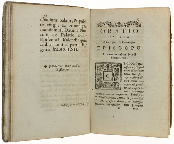 PRIMAE SYNODI PINAROLIENSIS Sub Illustrissimo, & Reverendissimo D.D. Joanne Baptista D'Orlié de S. Innocent. ejusdem Diocesis Episcopo. Habitae diebus 14., 15, & 16. Septembris 1762. Scita. | Livres anciens et modernes | Pinerolo (Diocesi)