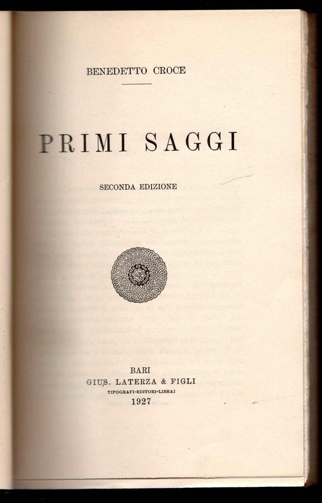 Argomento: Saggi. Autore: Croce Benedetto. Editore: Laterza. Luogo: Bari. Anno: 1927. Formato: in-8°. Pagg: 206. Legatura: Cartonata mezza legatura. Collana: Scritti vari 1. Primi saggi. Conservazione: buona. Titolo impresso sul dorso, piatto muto. Tagli non rifilati.