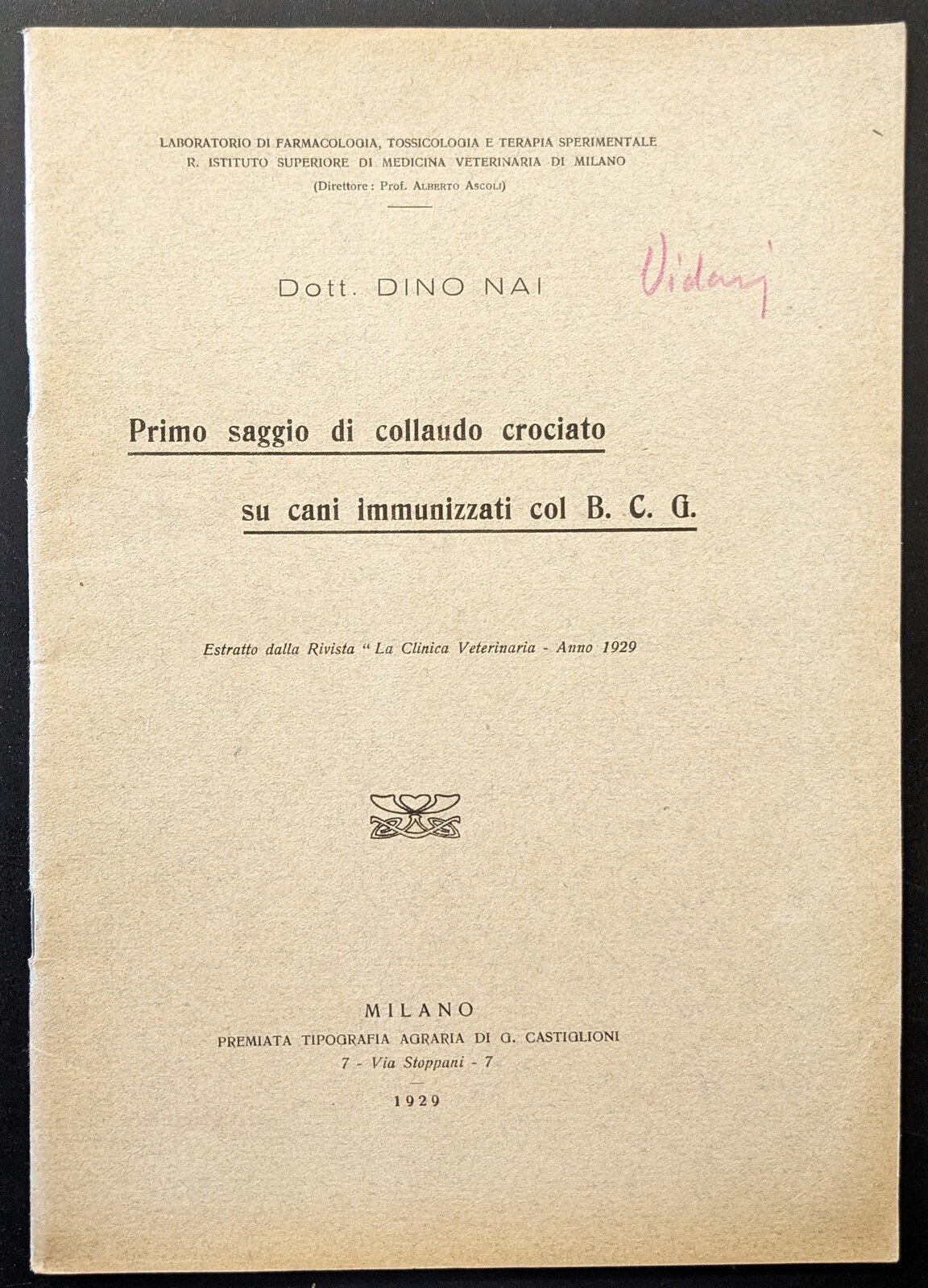 Opuscolo vintage. Argomento: Saggi. Autore: Nai Dino D. Editore: Premiata Tipografia Agraria di G. Castiglioni. Luogo: Milano. Anno: 1929. Formato: in-8°. Pagg: 21. Legatura: Punto metallico. Conservazione: buona. Laboratorio di farmacologia, tossicologia e terapia sperimentale R. Istituto Superiore di medicina veterinaria di Milano. Estratto dalla Rivista "La Clinica Veterinaria - Anno 1929. Tavola ripiegata all'interno.