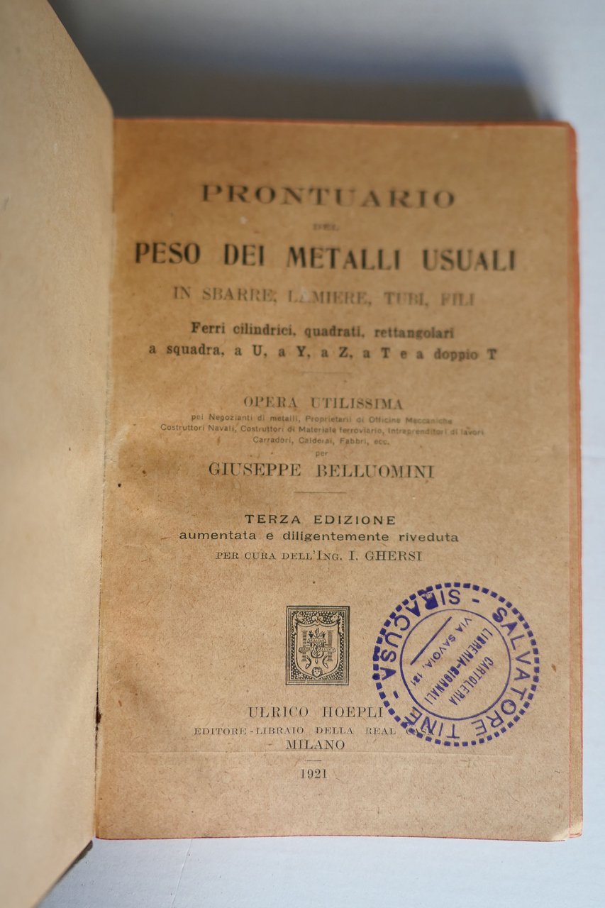 Prontuario del peso dei metalli usuali in sbarre lamiere,tubi e fili | Livres anciens et modernes | Belluomini Giuseppe
