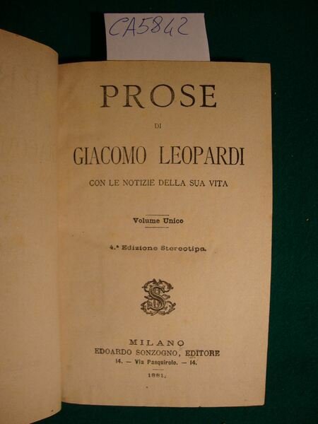 Prose di Giacomo Leopardi con le notizie della sua vita - Volume unico | Livres anciens et modernes | Leopardi Giacomo